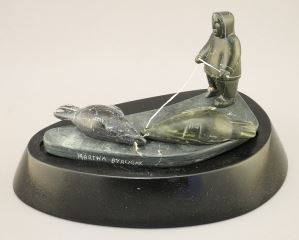 Copper Mine Stone Carving signed Martha Ayaligak, 6 5/8"L, "Seal Hunter" (toe chipped).