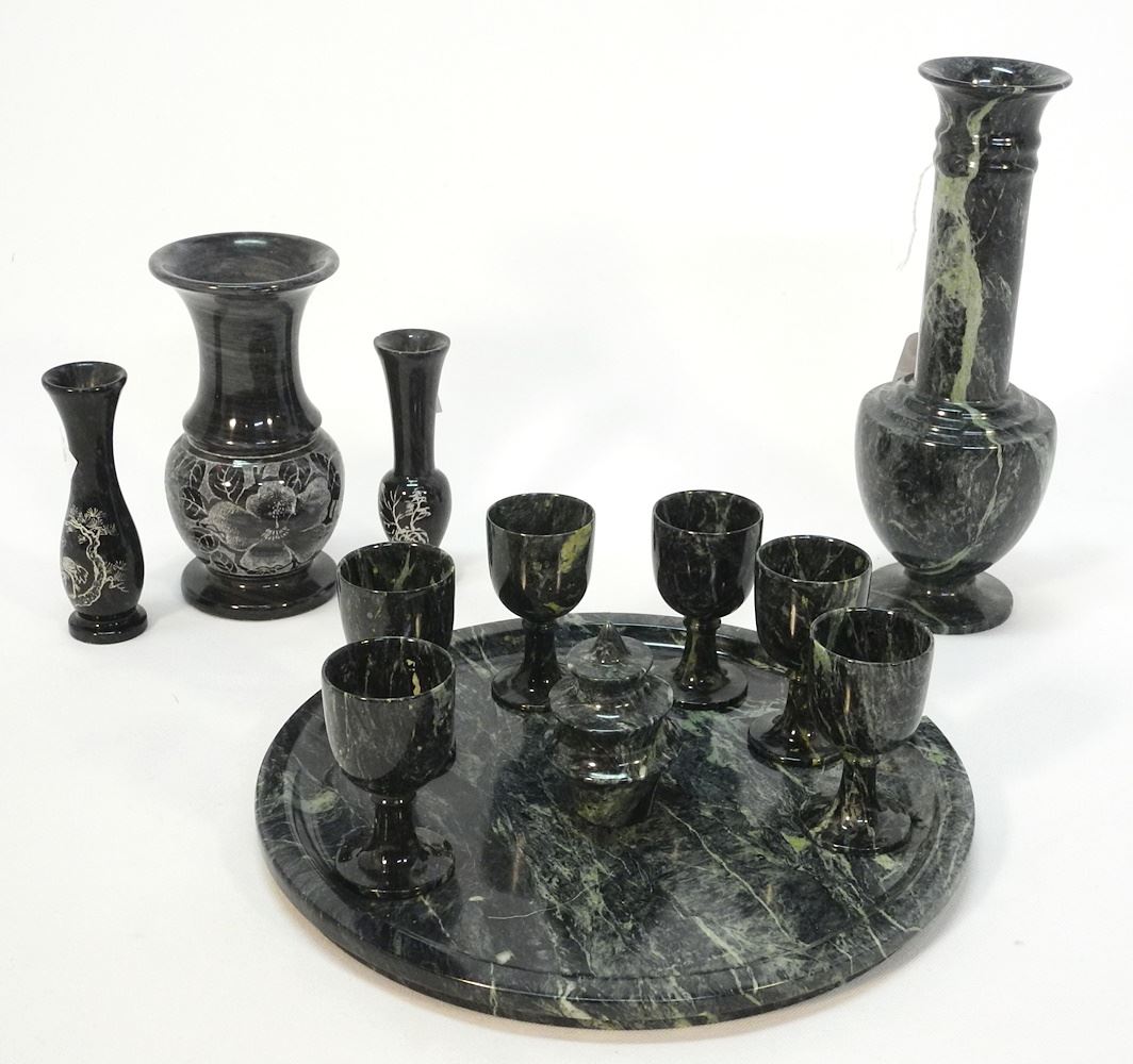 Asian Carved Marble Decanter & Vases , 9 3/8"H.