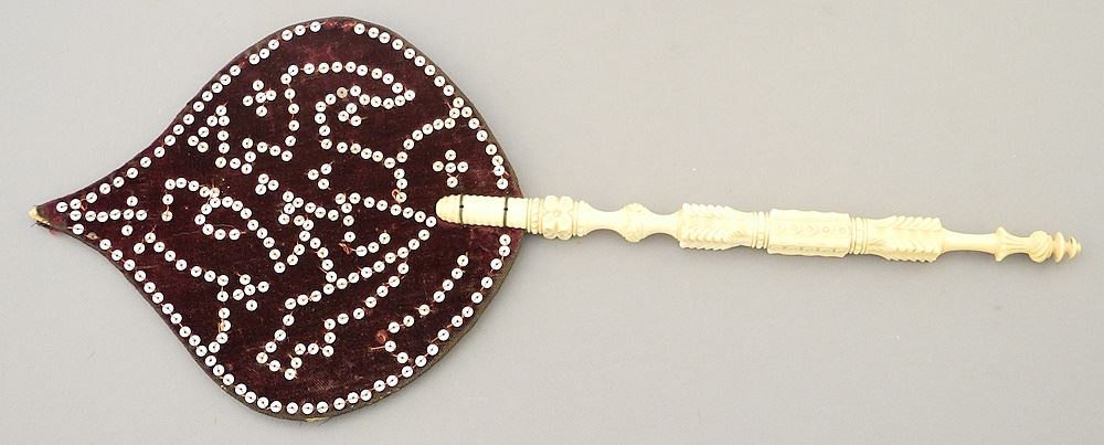 South Asian Carved Bone Fan (13 1/2"H) & Advertisement & Bull Card Holder, 2 7/8"W.