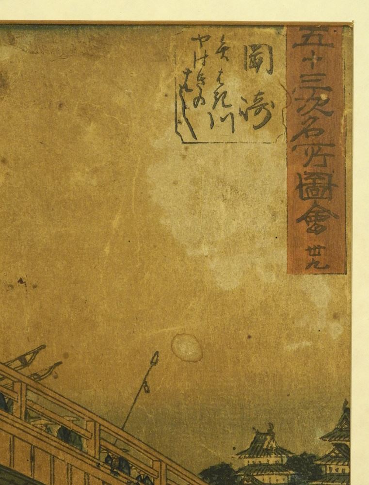 Woodblock by Ando Hiroshige, "Yahagi Bridge".
