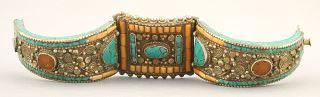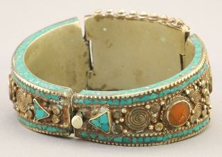 Tibetan White Metal Coral & Turquoise Hinged Bracelet, 3"W, 119.8 Grams.