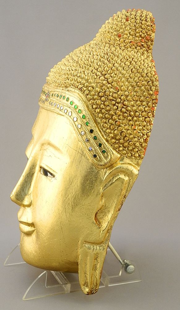 Thai Jeweled Giltwood Buddhist Mask, 12 3/8"H.