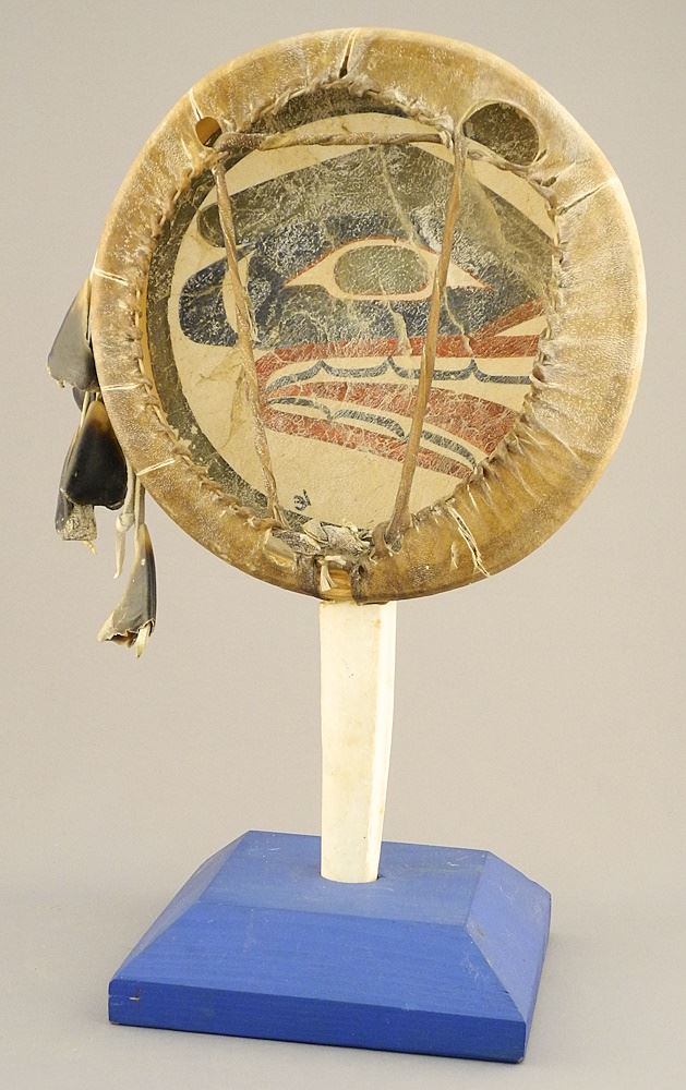 LOT 145 Kwagiulth Moon Drum with Whistle Handle, Monogrammed LC (Lorraine Charlie), 12 7/8"H on stan Estimate: $200 - $300 Auction Date: Tuesday, March 19 2024 at 4:00 PM