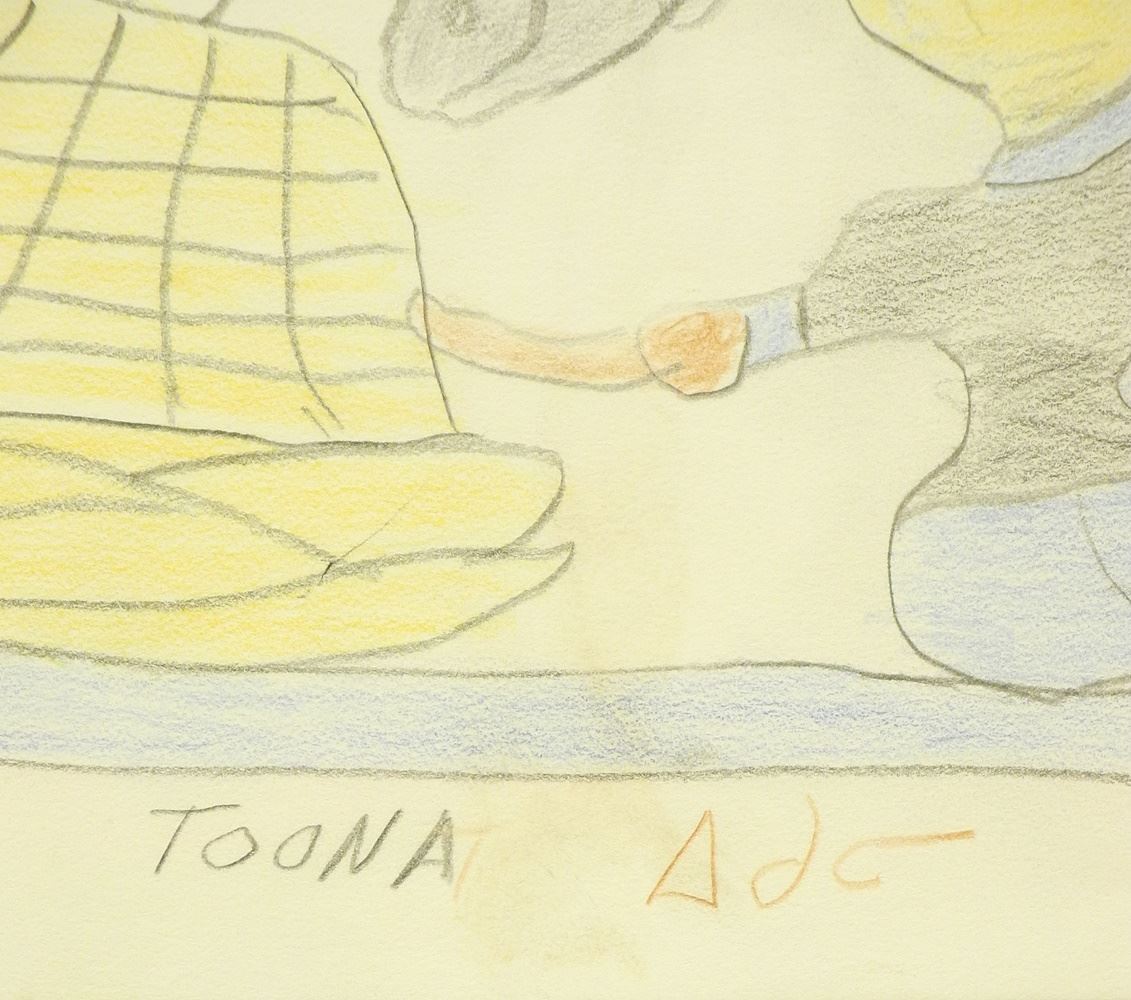 Coloured Pencil Drawing signed Toona , 11 1/2" x 9", "Carving Igloo with Animals".