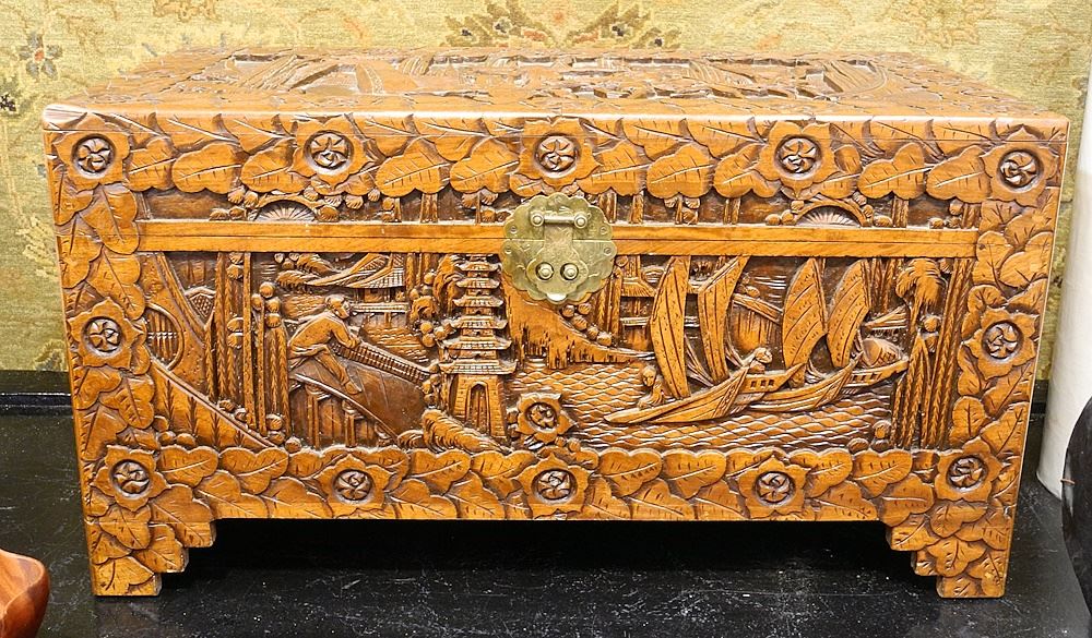 LOT 132 Hung Hop Hong Kong Deep Carved Camphor Wood Chest. Estimate: $100 - $200 Sold For: $170 Auction Date: Tuesday, May 28 2024 at 4:00 PM