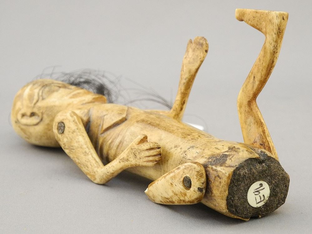 Hand Carved Bone Figure with Moving Appendages & Human Hair, 6 3/4" (one leg damaged).