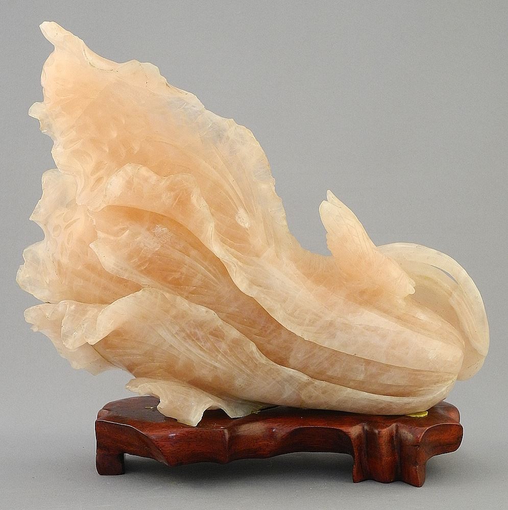 LOT 298 Chinese Pink Quartz Cabbage Carving, 7 5/8" x 9 3/4" x 3" with Stand. Estimate: $150 - $200 Sold For: $300 Auction Date: Tuesday, May 28 2024 at 4:00 PM