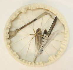 Northwest Coast Hide Drum (2 1/2" x 18" Diam.) with Stick & Eagle Feathers, NO EXPORT.