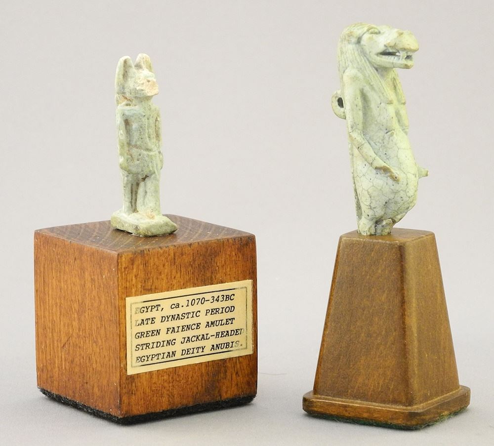 LOT 335 Faience Amulet of Anubis (2 1/4"H) with Certificate & Amulet of Tauret, 3 1/2"H (missing legs). Estimate: $100 - $200 Sold For: $130 Auction Date: Tuesday, May 28 2024 at 4:00 PM