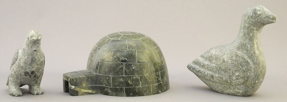 LOT 311 2 Inuit Stone Birds signed & Attributed to William Noah (2 1/2" & 3 1/4"H) & Igloo (unsigned Estimate: $60 - $100 Sold For: $100 Auction Date: Tuesday, May 28 2024 at 4:00 PM
