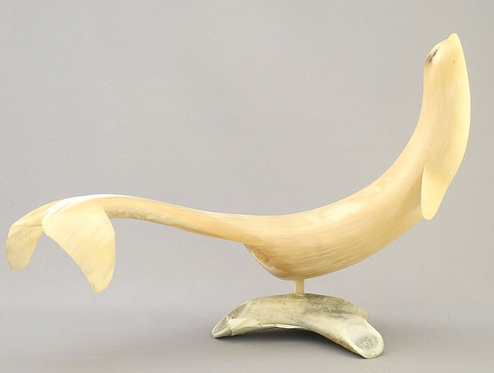 Muskox Horn Inuit Sculpture signed Migiyok, 12"L, "Beluga Whale".