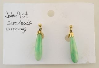 LOT 82 Pair of 9ct & Jade Droplet Screwback Earrings, Approx. 4g. Estimate: $80 - $100 Sold For: $110 Auction Date: Tuesday, May 28 2024 at 4:00 PM