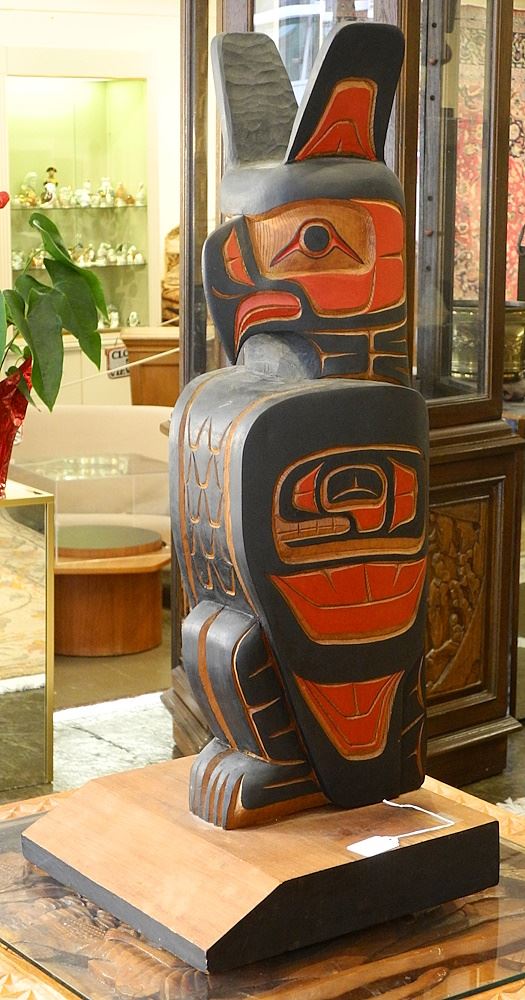 LOT 6 Cedar Pole signed SK Thompson, 28 1/2"h, "Hawk". Estimate: $500 - $600 Sold For: $500 Auction Date: Tuesday, May 28 2024 at 4:00 PM