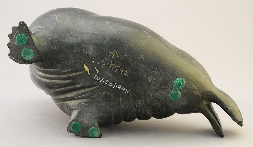 Inuit Stone Sculpture signed E9-1595 , 8 3/4"L, "Walrus" (no tusks, chip noted).