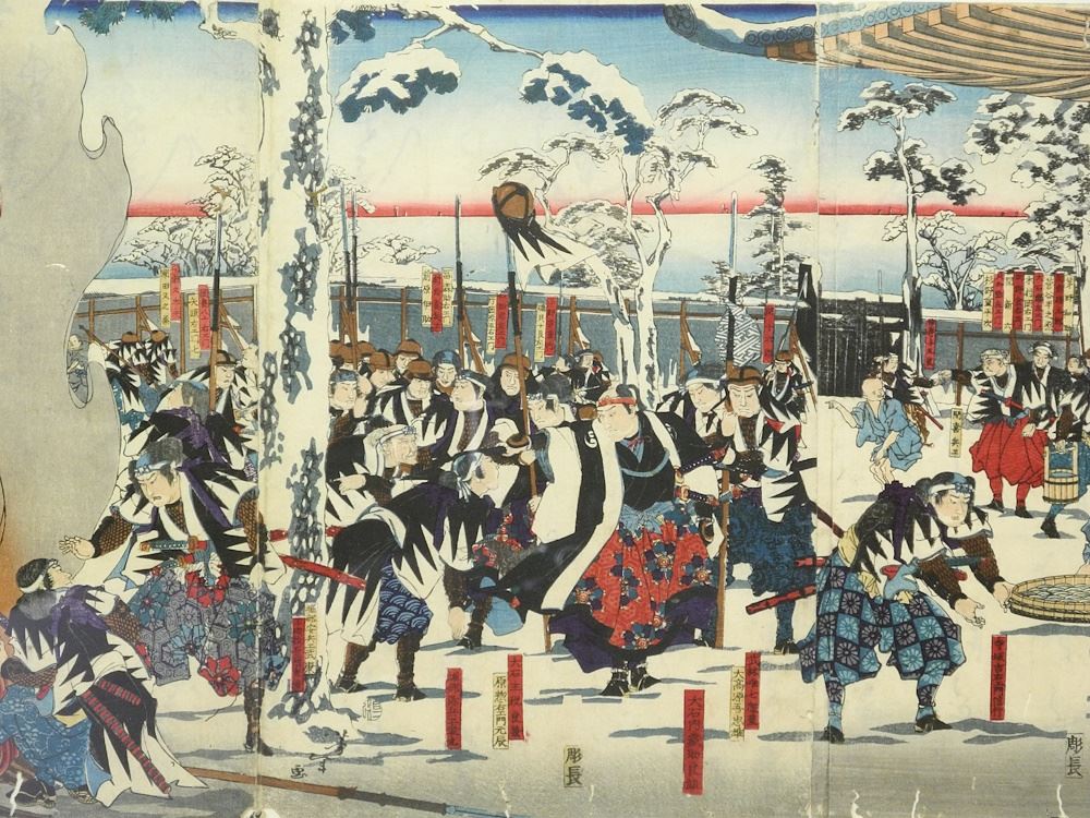 LOT 56 Japanese Woodblock Triptych by Tsukioka Yoshite, 14" x 28", "Ronin Story" with Literature. Estimate: $350 - $500 Sold For: $400 Auction Date: Tuesday, May 28 2024 at 4:00 PM