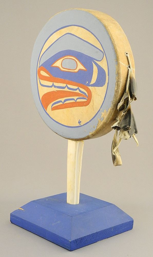 LOT 252 Kwagiulth Moon Drum with Whistle Handle, Monogrammed LC (Lorraine Charlie), 12 7/8"H on stan Estimate: $150 - $250 Sold For: $130 Auction Date: Tuesday, May 28 2024 at 4:00 PM