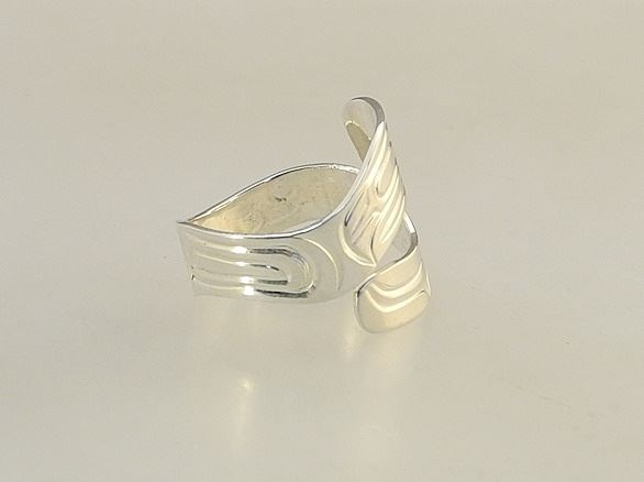 LOT 317 Kwagiulth Ring Monogrammed SS (Solomon Seward) 2023, Size 9 1/4, 4.32 Grams, "Whale". Estimate: $80 - $100 Sold For: $70 Auction Date: Tuesday, May 28 2024 at 4:00 PM