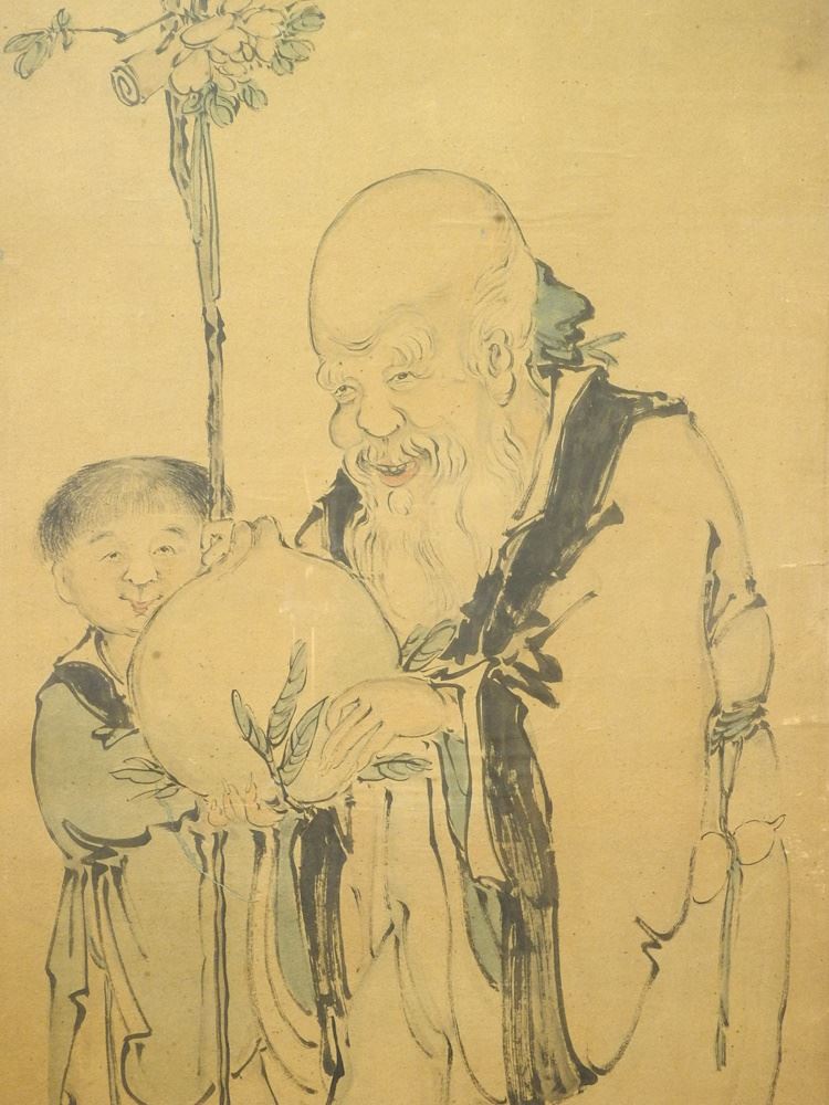 Old Chinese Ink & Colour on Paper, 39 1/2 x 21 1/2", "Shou Lao Pomegranate & Child".