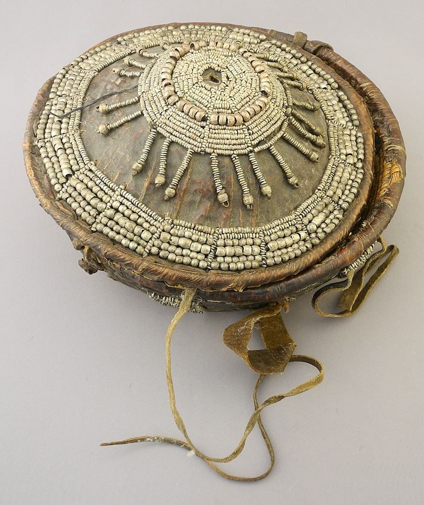 Ethiopian Covered Basket with Metal Beadwork, 9 1/8" Diameter.