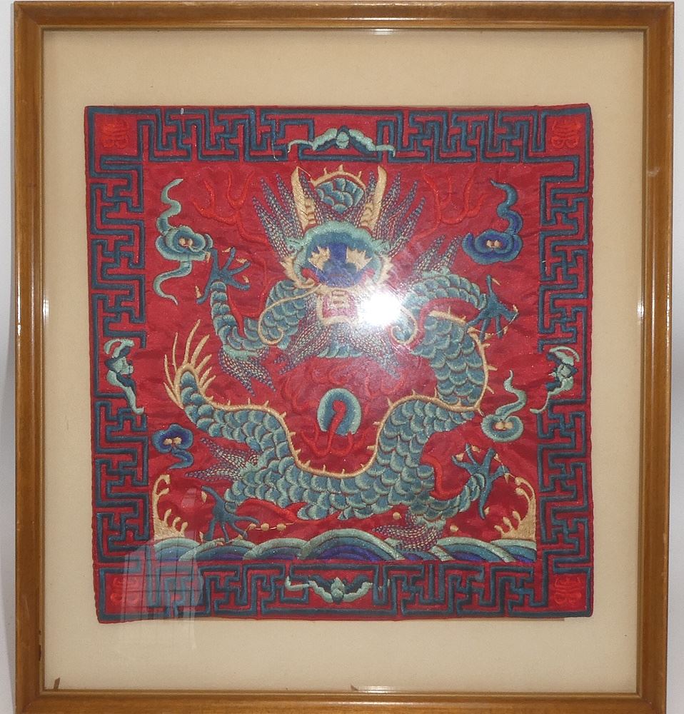 LOT 106 19th C. Framed Emperial Embroidery of Dragon, 10 1/2" x 10 1/4". Estimate: $150 - $250 Sold For: $80 Auction Date: Tuesday, July 16 2024 at 4:00 PM