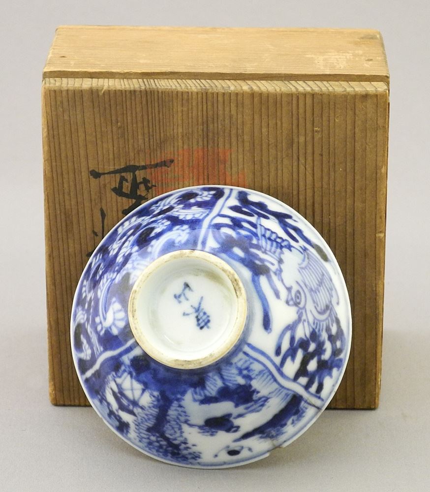 Old Japanese Blue & White Porcelain Sake Cup with Box, 2 5/8" Diameter (as found).