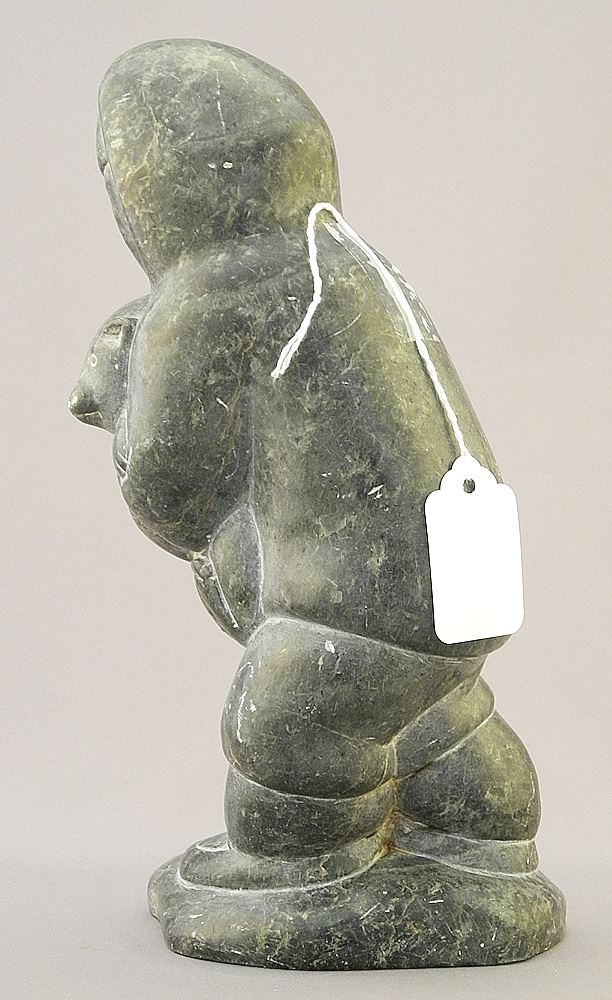 Inuit Stone Figure with Puppy signed with Syllabics & Eskimo Art Label, 9"h.