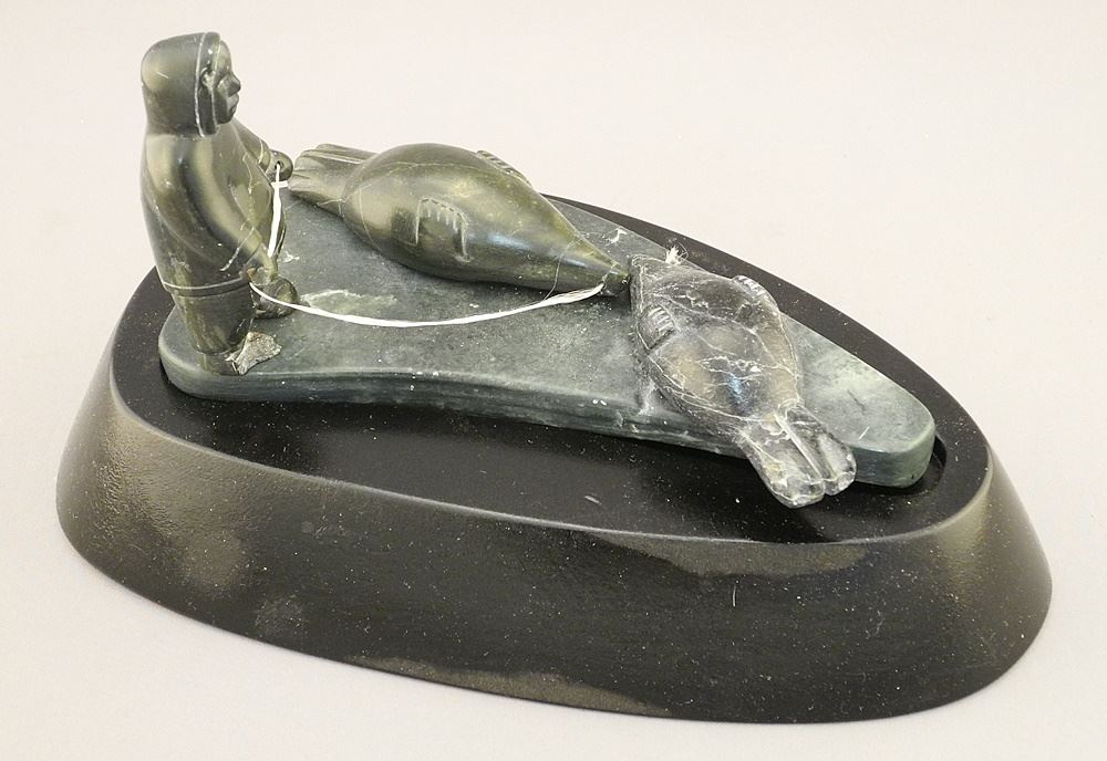 Copper Mine Stone Carving signed Martha Ayaligak, 6 5/8"L, "Seal Hunter" (toe chipped).
