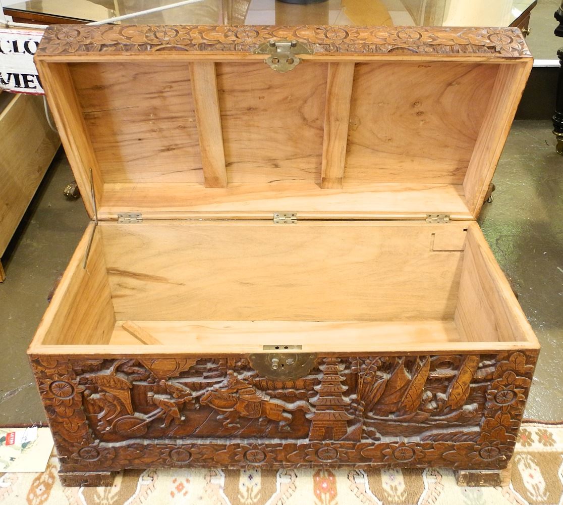 LOT 253 Asian Deep Carved Camphor Trunk, 20 3/4" x 40" x 19" (as found). Estimate: $100 - $200 Sold For: $140 Auction Date: Tuesday, July 16 2024 at 4:00 PM