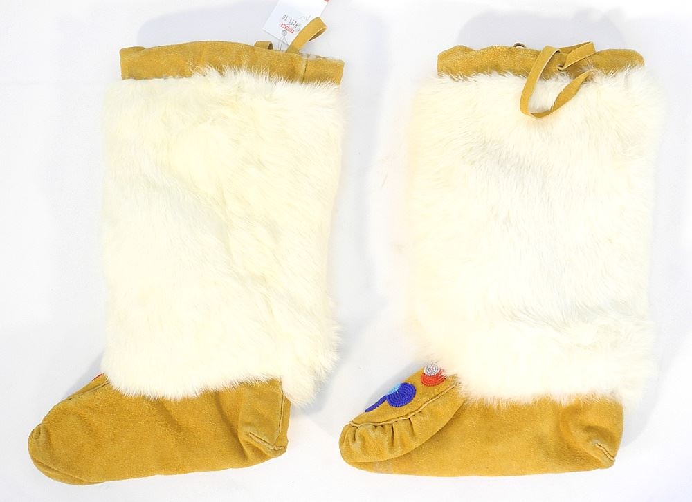 Pair of Beaded & Fur Trimmed Tanned Hide Mukluks, 9"L.