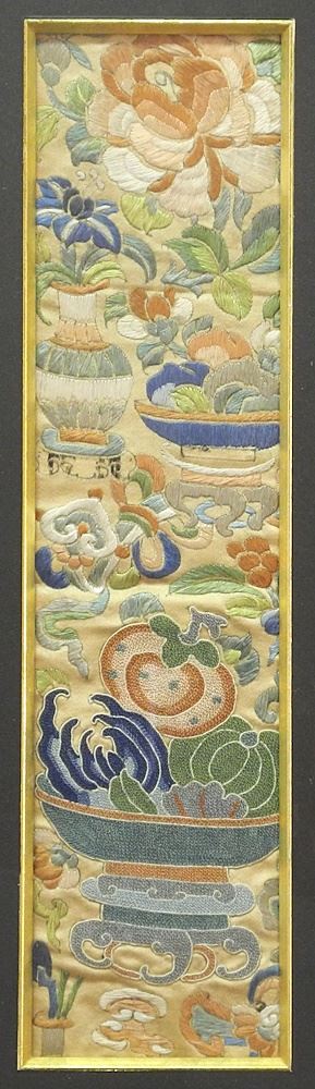 2 Mandarin Silk Sleeve Panels, Framed, 13" & 19 3/4"h.