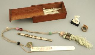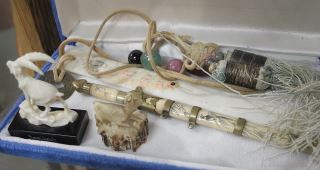 LOT 148 Collection of Bone Items: Hand Painted Spellicans / Jap. Bookmark / 2 Figures / Dagger, NO EXP Estimate: $50 - $100 Sold For: $35 Auction Date: Tuesday, September 17 2024 at 4:00 PM