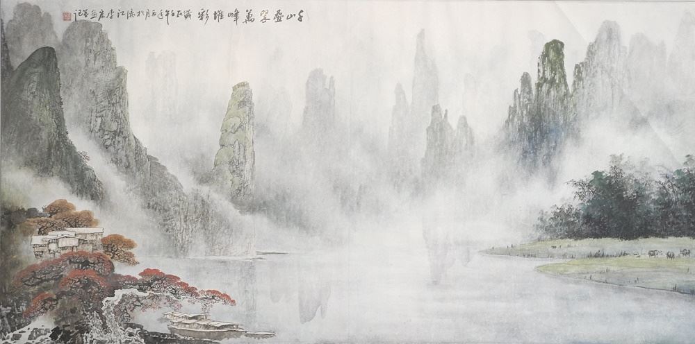 Chinese Ink & Colour Painting signed Li Hongyu, 25 3/4" x 51 1/4", "Misty River Vista".