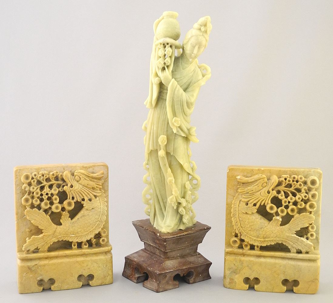 Pair of Chinese Carved Softstone Bookends & Kwan Yin Figure, 5 1/4" & 12"h.