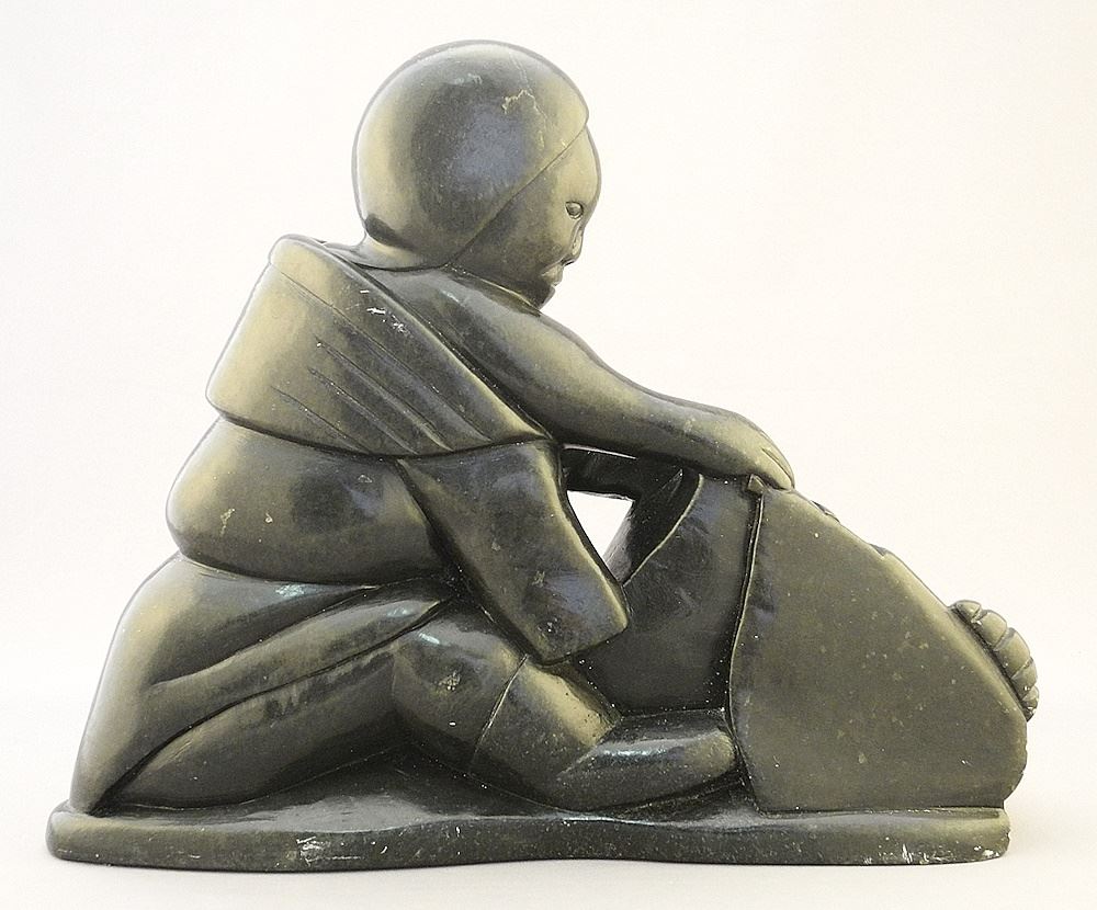 Inuit Sculpture signed Sampson Kingalik, 11" x 9" x 3 1/2", "Figure Skinning Seal".
