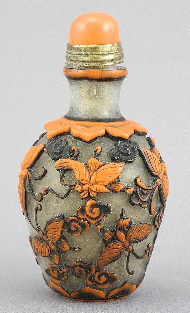 Red & Black Overlay Glass Snuff Bottles with Qianlong Mark, 2 7/8"h.