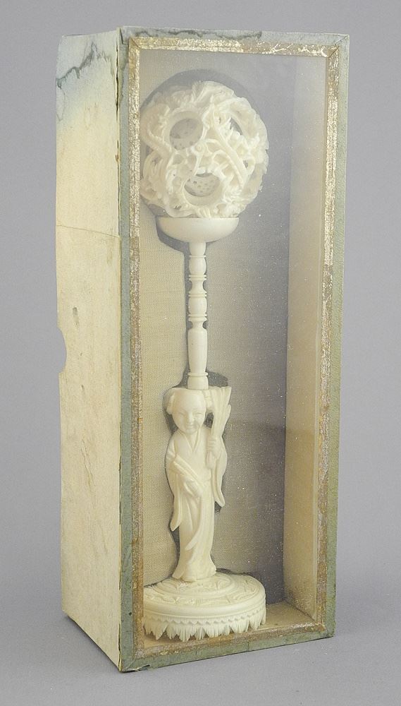 LOT 118 Chinese Carved Puzzle Ball on Figural Stand (8 5/8"h) with Case, NO EXPORT. Estimate: $100 - $200 Sold For: $100 Auction Date: Tuesday, November 26 2024 at 4:00 PM