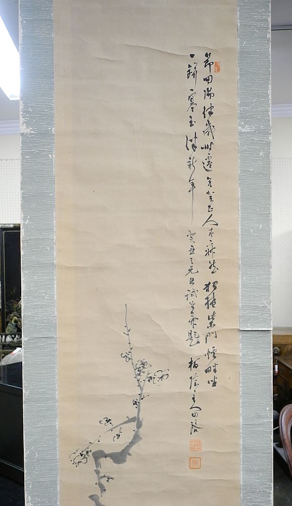 LOT 264 Japanese Ink Scroll Attributed to Tanaka Hakuin, 52 1/2" x 13", "Plum & Bamboo". Estimate: $100 - $200 Auction Date: Tuesday, November 26 2024 at 4:00 PM