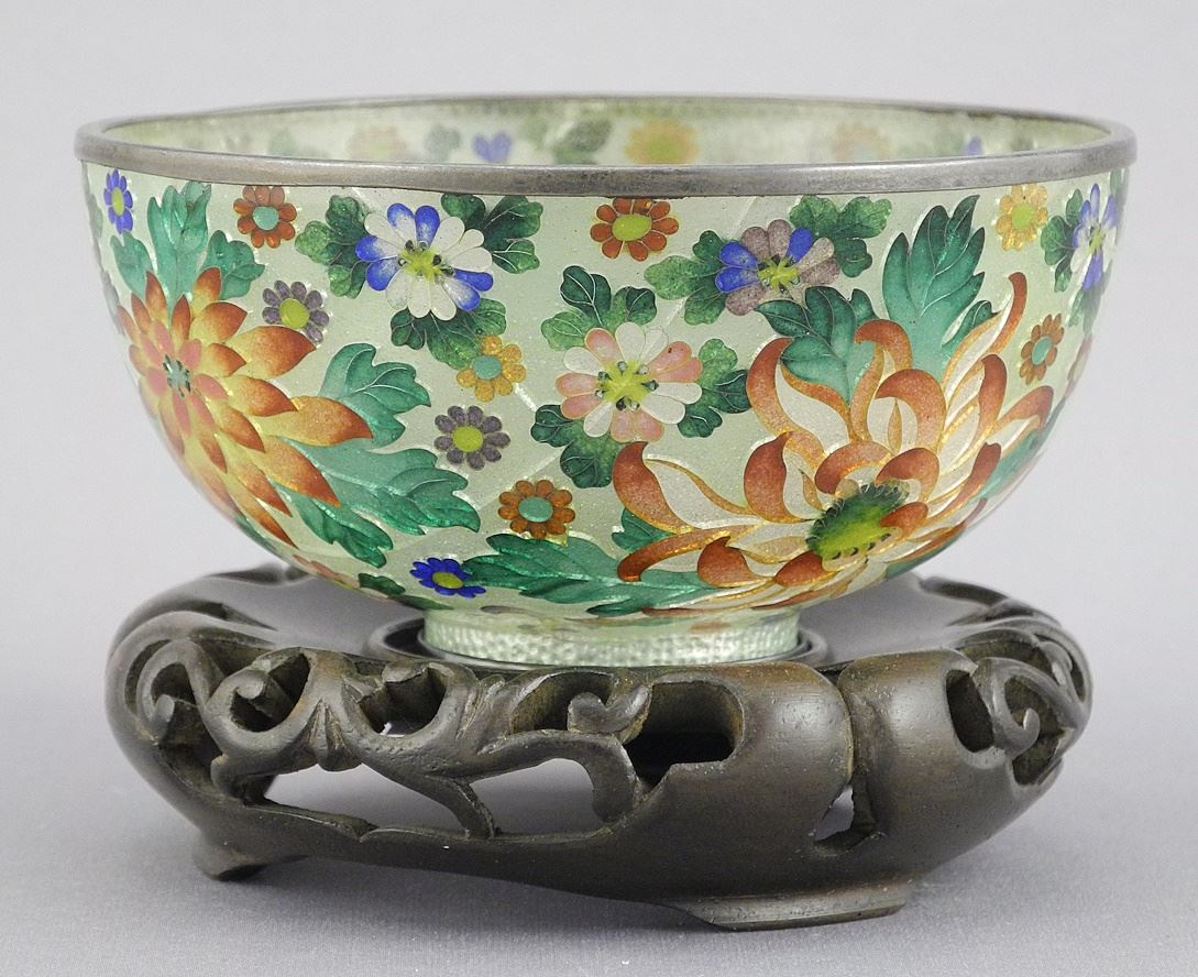 Chinese Plique a Jour Enamel Bowl (1 7/8" x 3 3/4" Diameter) with Wood Stand