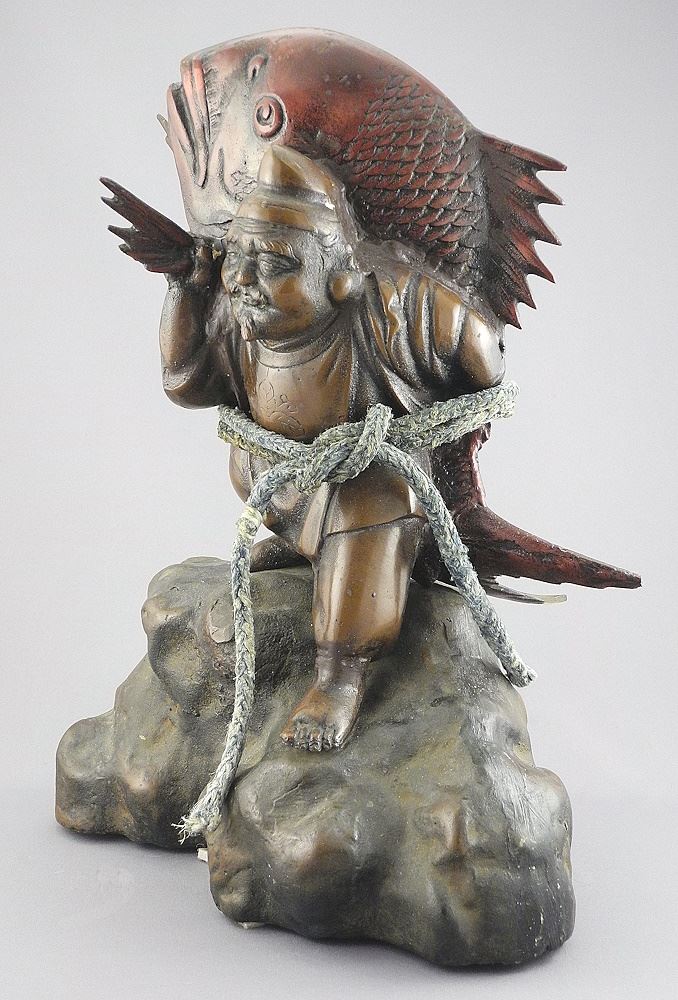 Japanese Bronze Sculpture, 15"h, "Ebisu & Giant Fish".