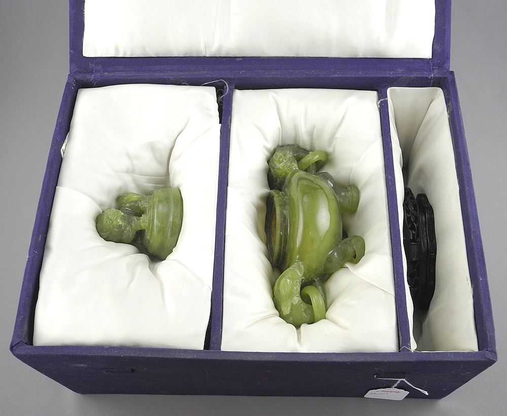 3 Chinese Green Stone Carvings: Censer (5"h) & Pair of Elephants, 3 3/4"L with Stands & Boxe