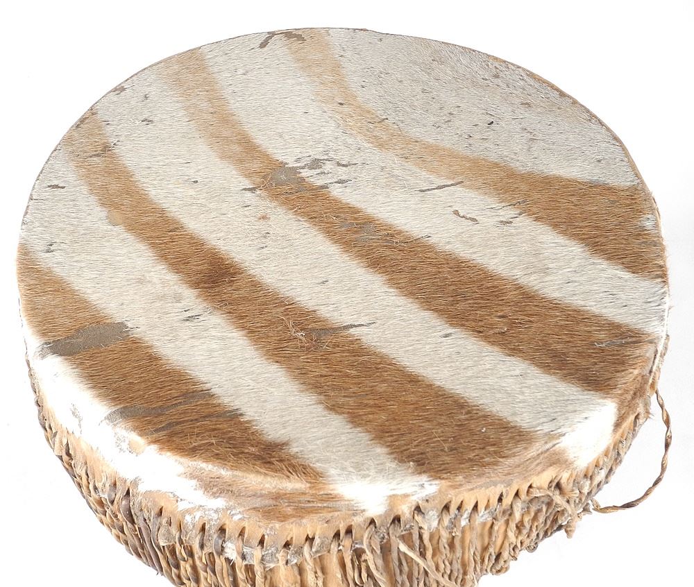 African Zebra Hide Drum, 14 1/2" Diameter, 14 3/4"h.
