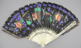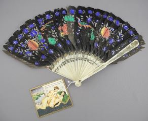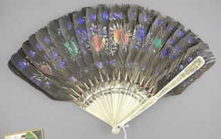 Painted Feather Fan with Bone Sticks & Indian Miniature, 9 1/4"L & 3 3/4" W, NO EXPORT.