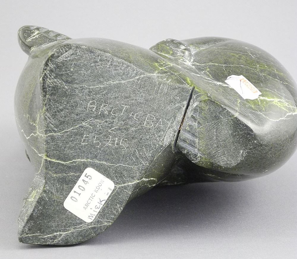 LOT 2 Arctic Bay Stone Sculpture signed E5215, 8 1/4"h, "Two Seals". Estimate: $100 - $200 Sold For: $90 Auction Date: Tuesday, November 26 2024 at 4:00 PM