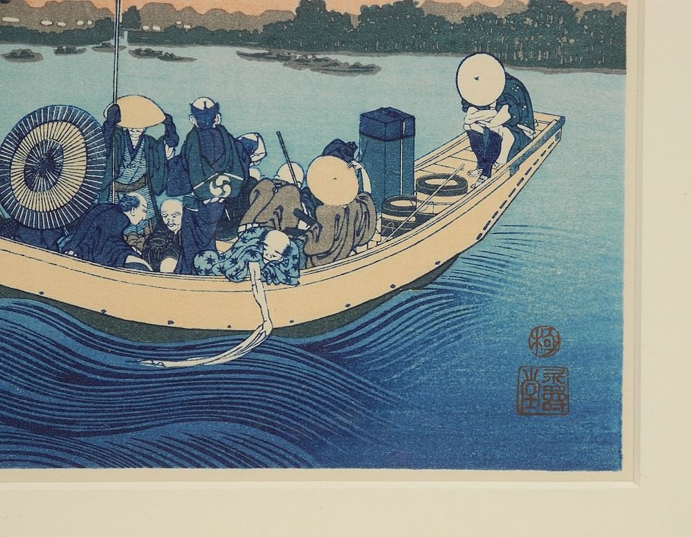 LOT 250 Colour Woodblock by Hokusai, 8" x 11 1/2", "Viewing Sunset over Ryogoku Bridge". Estimate: $100 - $150 Sold For: $200 Auction Date: Tuesday, November 26 2024 at 4:00 PM