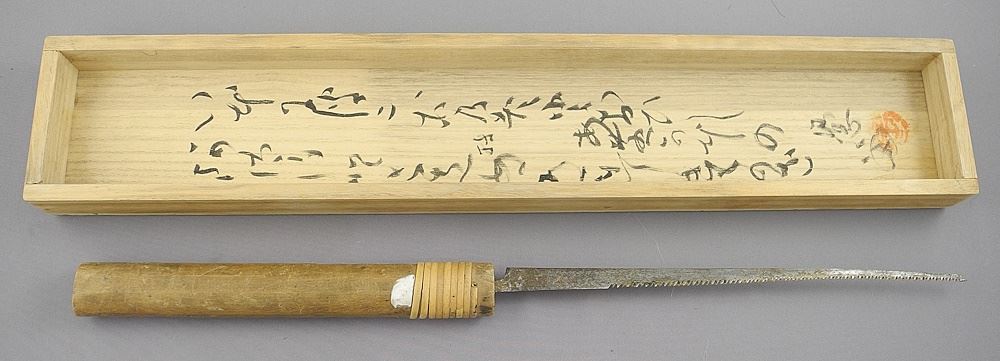 LOT 155 Japanese Serrated Knife in Scroll Case, 15 5/8" & 16 5/8"L. Estimate: $50 - $100 Sold For: $50 Auction Date: Tuesday, November 26 2024 at 4:00 PM