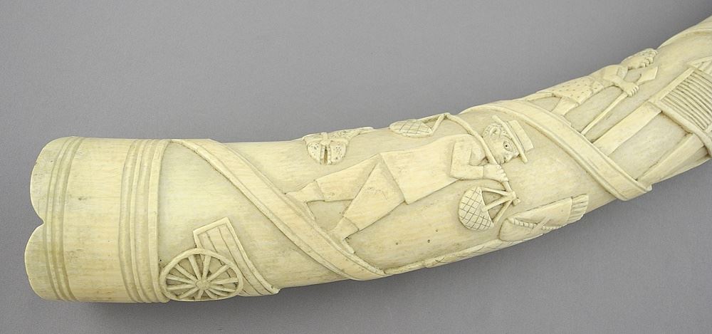LOT 322 Congolese Tusk with Colonial Narrative Scenes, 23 1/8"L, NO EXPORT. Estimate: $250 - $500 Sold For: $550 Auction Date: Tuesday, November 26 2024 at 4:00 PM