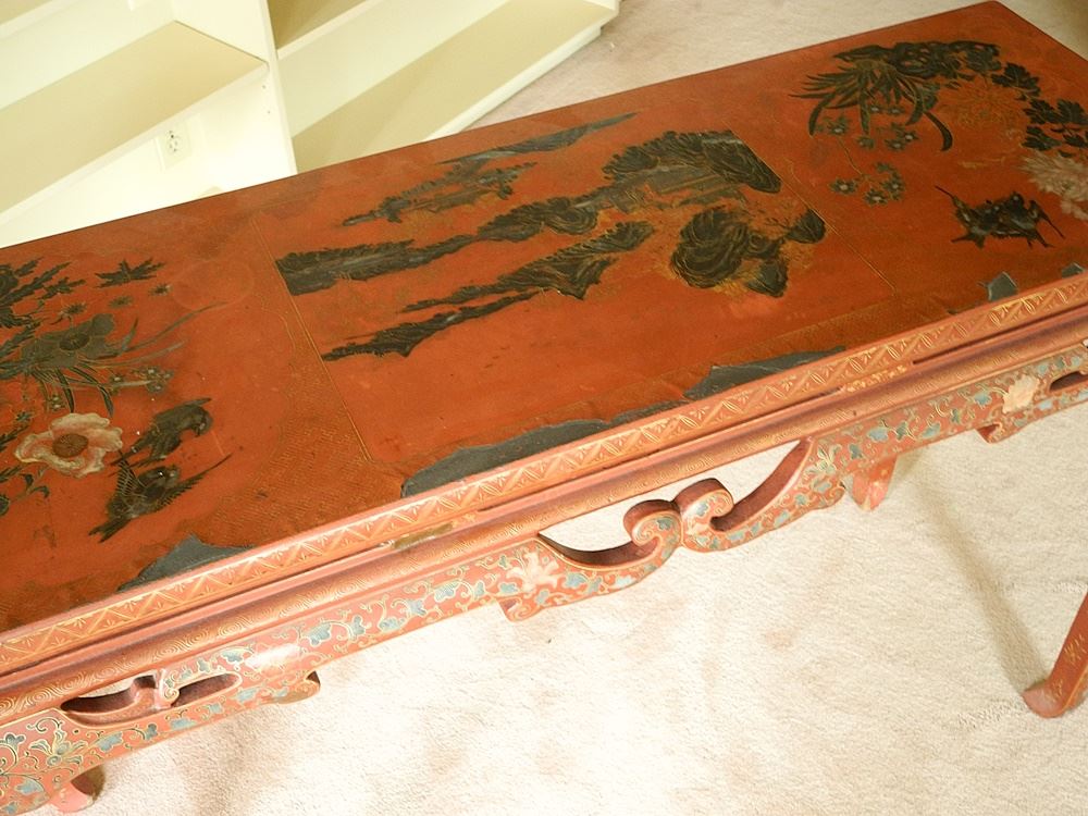 LOT 4 Chinese Red Lacquered Gold Painted Altar Table, 51" x 19" x 33 1/2"h. Estimate: $100 - $200 Sold For: $80 Auction Date: Tuesday, November 26 2024 at 4:00 PM
