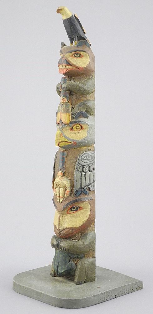 Haida Model Totem Pole signed Mark Spence June 6th 1945, Massett QCI, 11"h.