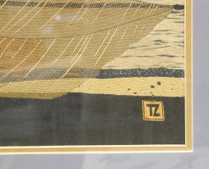 LOT 205 Silk Needlework Panel Monogrammed TZ, 18" x 21 3/8", "South Asian Fishing Scene". Estimate: $50 - $100 Sold For: $70 Auction Date: Tuesday, November 26 2024 at 4:00 PM