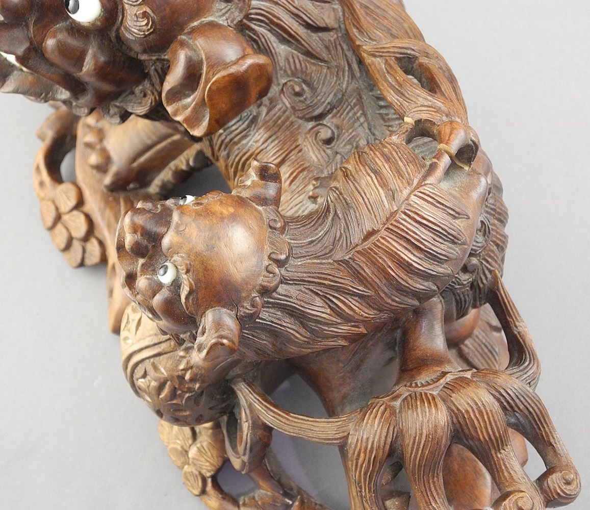 Japanese Carved Hardwood Shishi & Pup, 9 5/8"w.